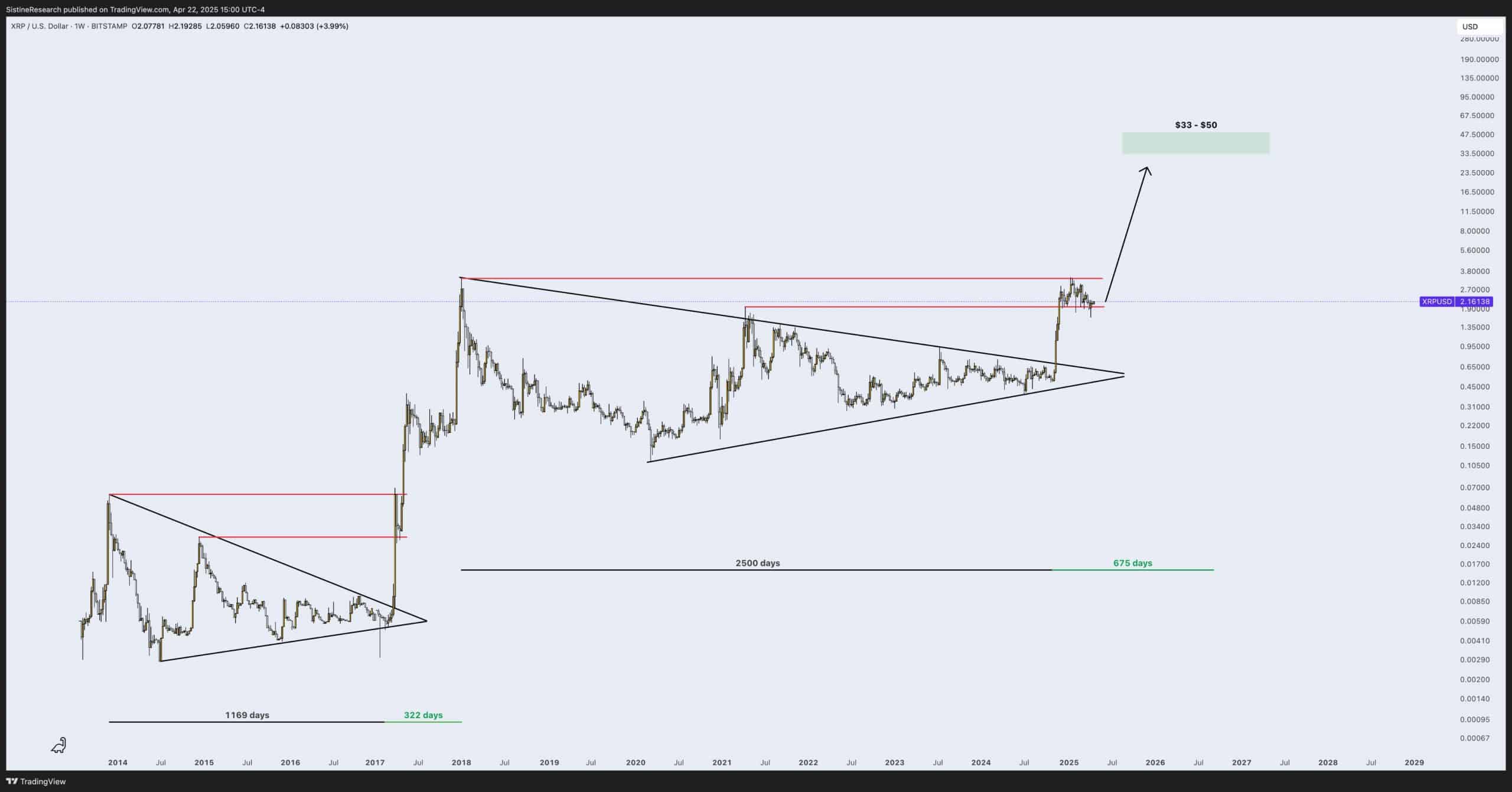 Mientras la comunidad debate sobre los fundamentos de esta teoría, algunas firmas analíticas como Sistine Research han ido más allá en sus proyecciones. En su modelo técnico, estiman que XRP podría alcanzar una franja de entre $33 y $50 en su próximo ciclo alcista, una cifra que representaría una subida superior al 2.000% desde su nivel actual.