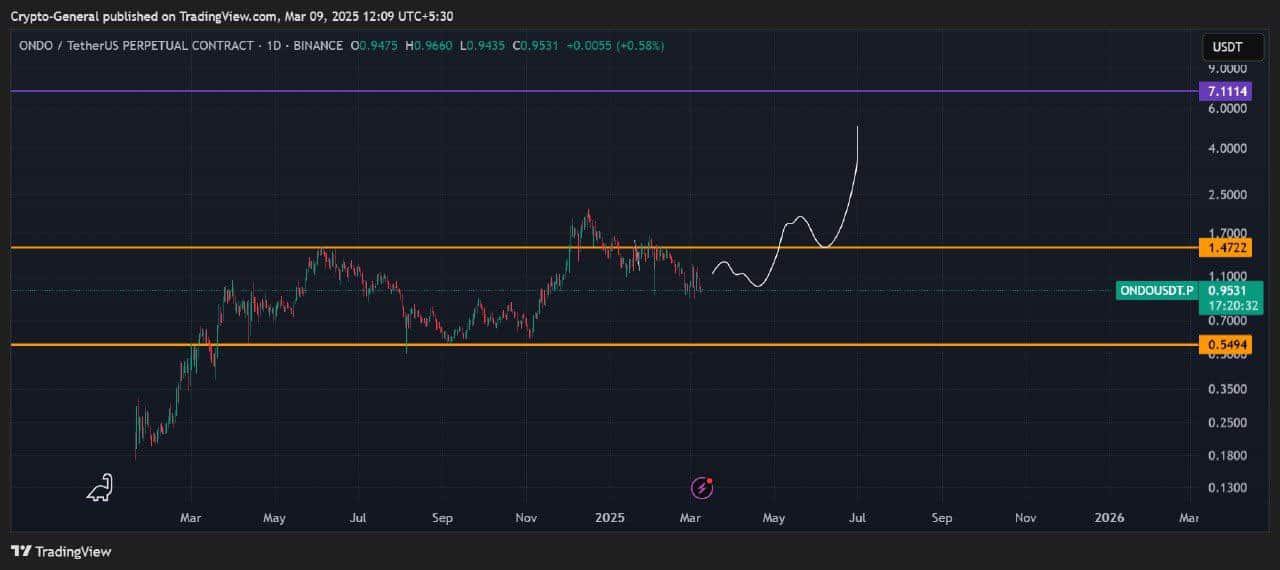 El reconocido analista de X, Crypto General, destacó que ONDO se está consolidando en un rango de $0.57 a $1.47, señalando que el precio actual representa un buen punto de entrada. Además, proyectó un objetivo de $7 a $10 para esta temporada alcista.