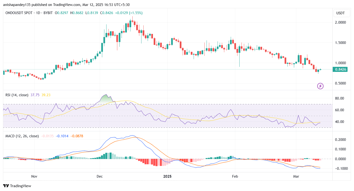 - RSI (Relative Strength Index): Con un valor actual de 37, el RSI sugiere que ONDO podría estar infravalorado, lo que podría atraer compras especulativas.