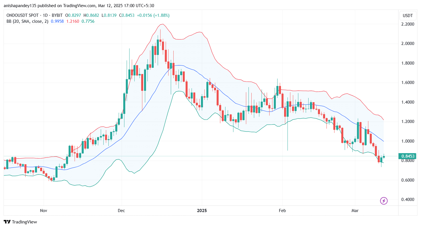 - Bollinger Bands: El precio de ONDO se encuentra cerca de la banda inferior, lo que indica una posible situación de sobreventa y un eventual rebote al alza.