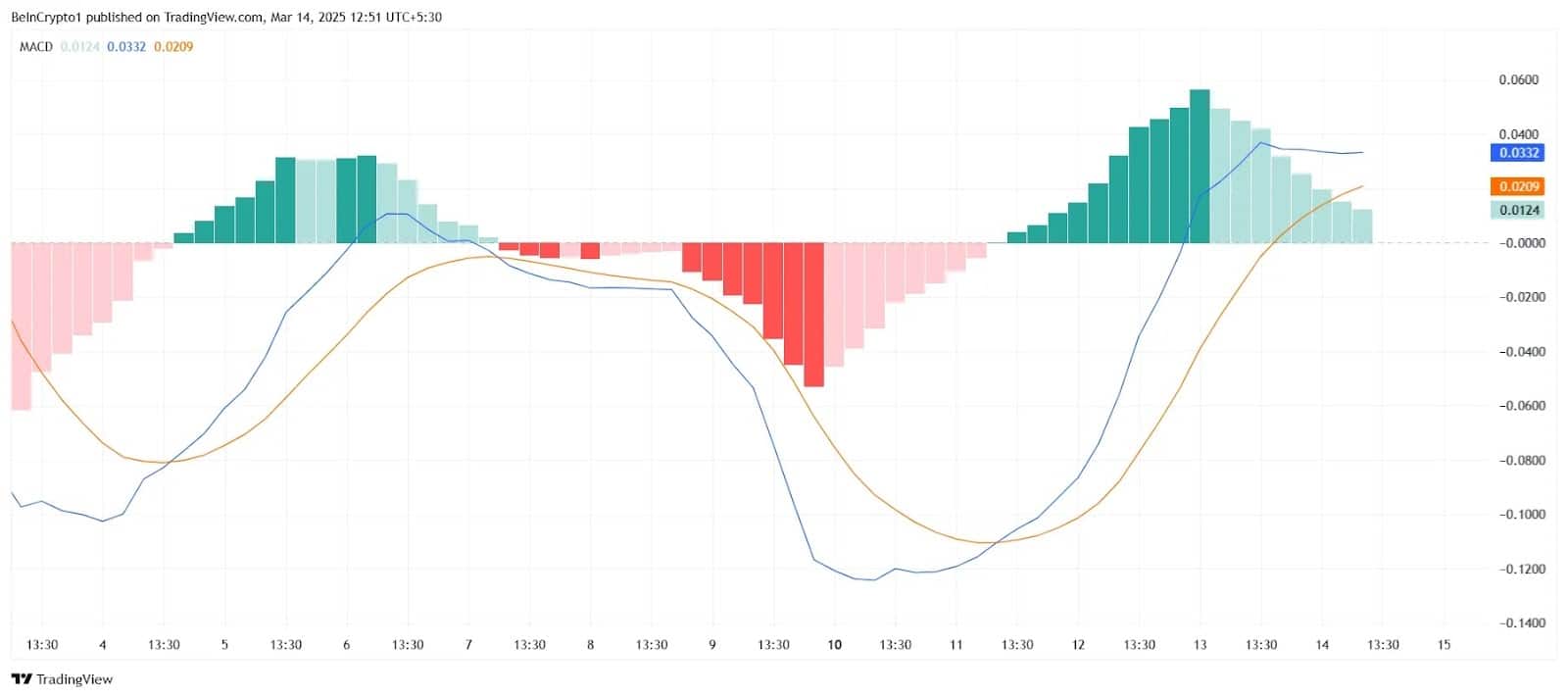 El MACD (Moving Average Convergence Divergence), un indicador clave utilizado para evaluar la dirección de la tendencia, muestra una posible cruz bajista. Esto indica que el impulso de Pi Coin podría continuar debilitándose, aumentando la posibilidad de una caída más profunda.