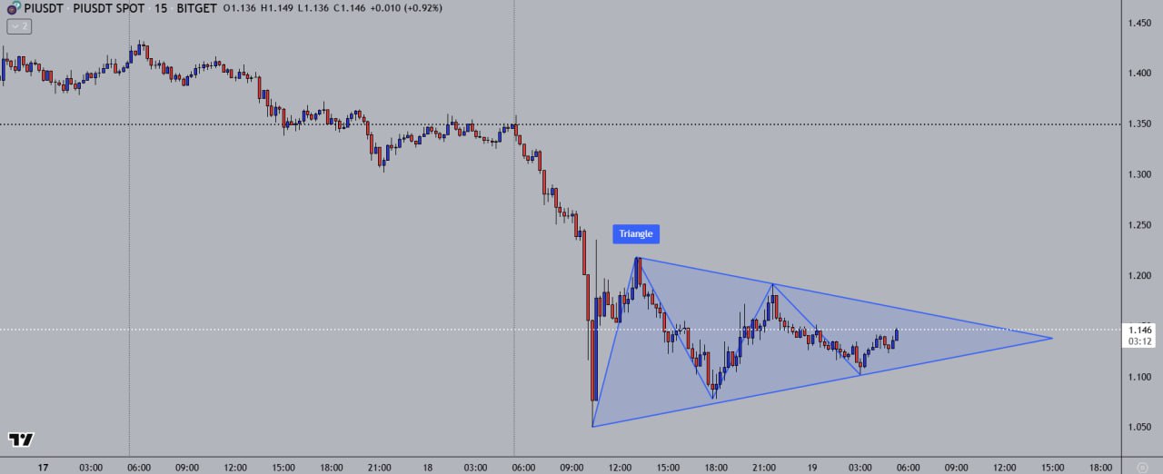 El gráfico de 15 minutos de PI muestra un patrón de triángulo simétrico, una formación clásica que indica una posible ruptura en el precio. Si PI logra superar la resistencia en $1.20, podría alcanzar la zona de $1.25 a $1.30 en el corto plazo. Sin embargo, si la presión vendedora persiste, el precio podría retroceder hasta los $1.10 y, en caso de mayor debilidad, incluso hasta $1.05 o $1.02.