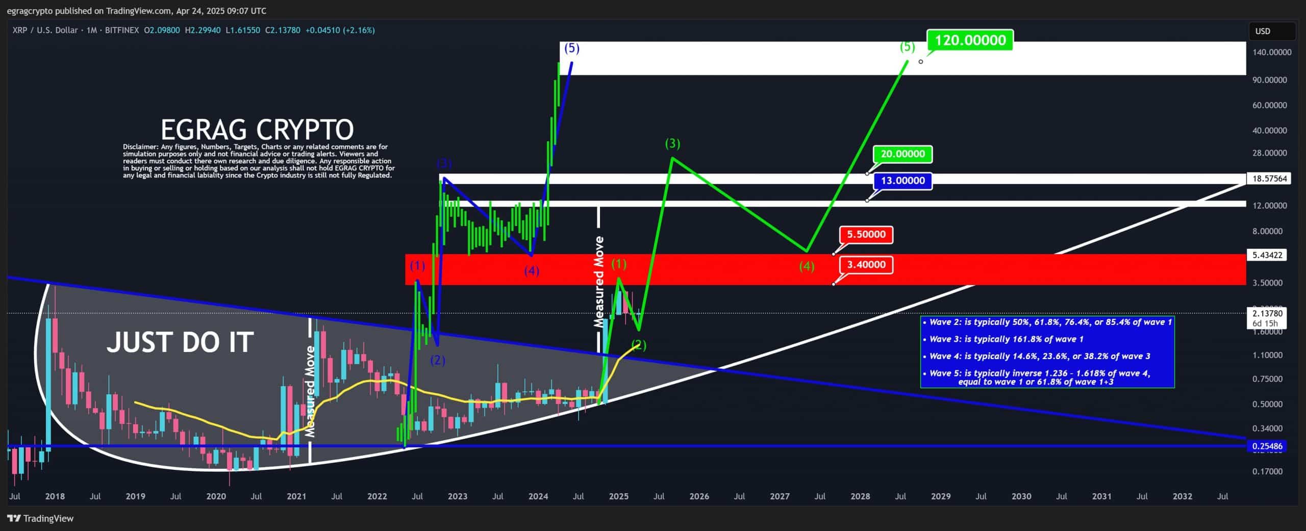 EGRAG CRYPTO, conocido por sus análisis basados en patrones históricos y estructuras de ondas de Elliott, ha lanzado una proyección que podría redefinir el panorama de XRP. Según su más reciente publicación en X (anteriormente Twitter), el precio de XRP estaría replicando el comportamiento que precedió al gran rally de 2017, cuando su valor se disparó de centavos a más de $3 en cuestión de semanas.