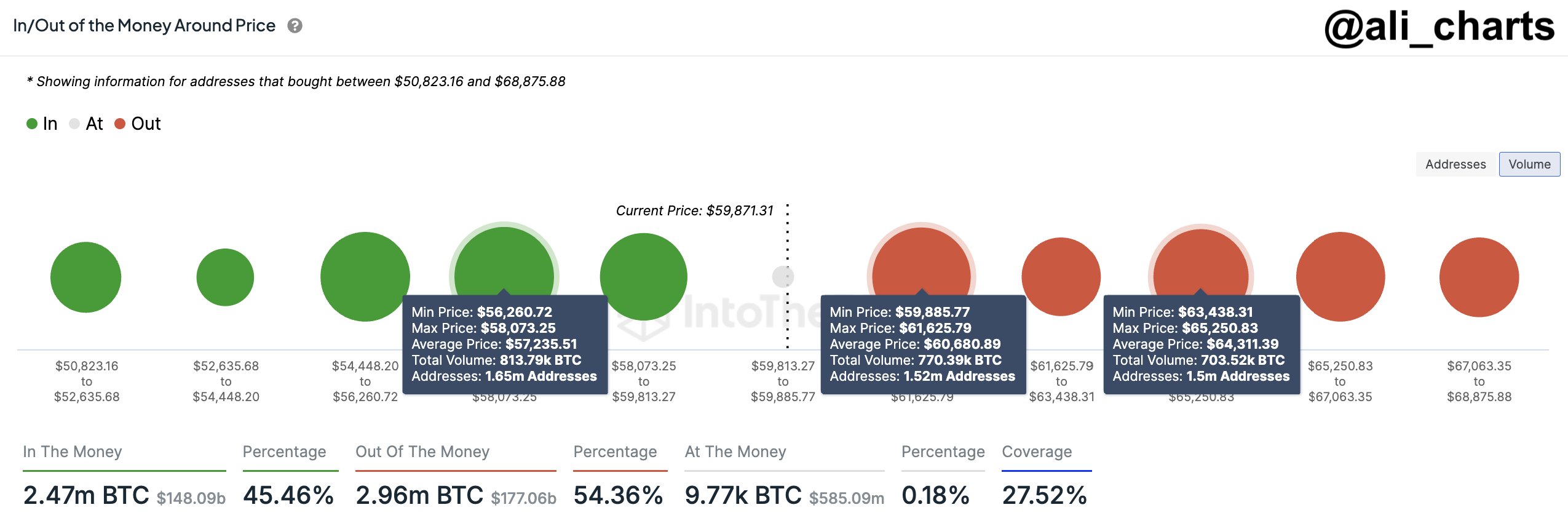 - Resistencia fuerte en $64.300: Según el analista técnico Ali, el precio de bitcoin enfrentará una resistencia significativa alrededor de los $64.300. Si el precio no logra superar este nivel, podríamos ver una corrección hacia el rango de los $51.000 a $54.000 antes de intentar otro repunte.