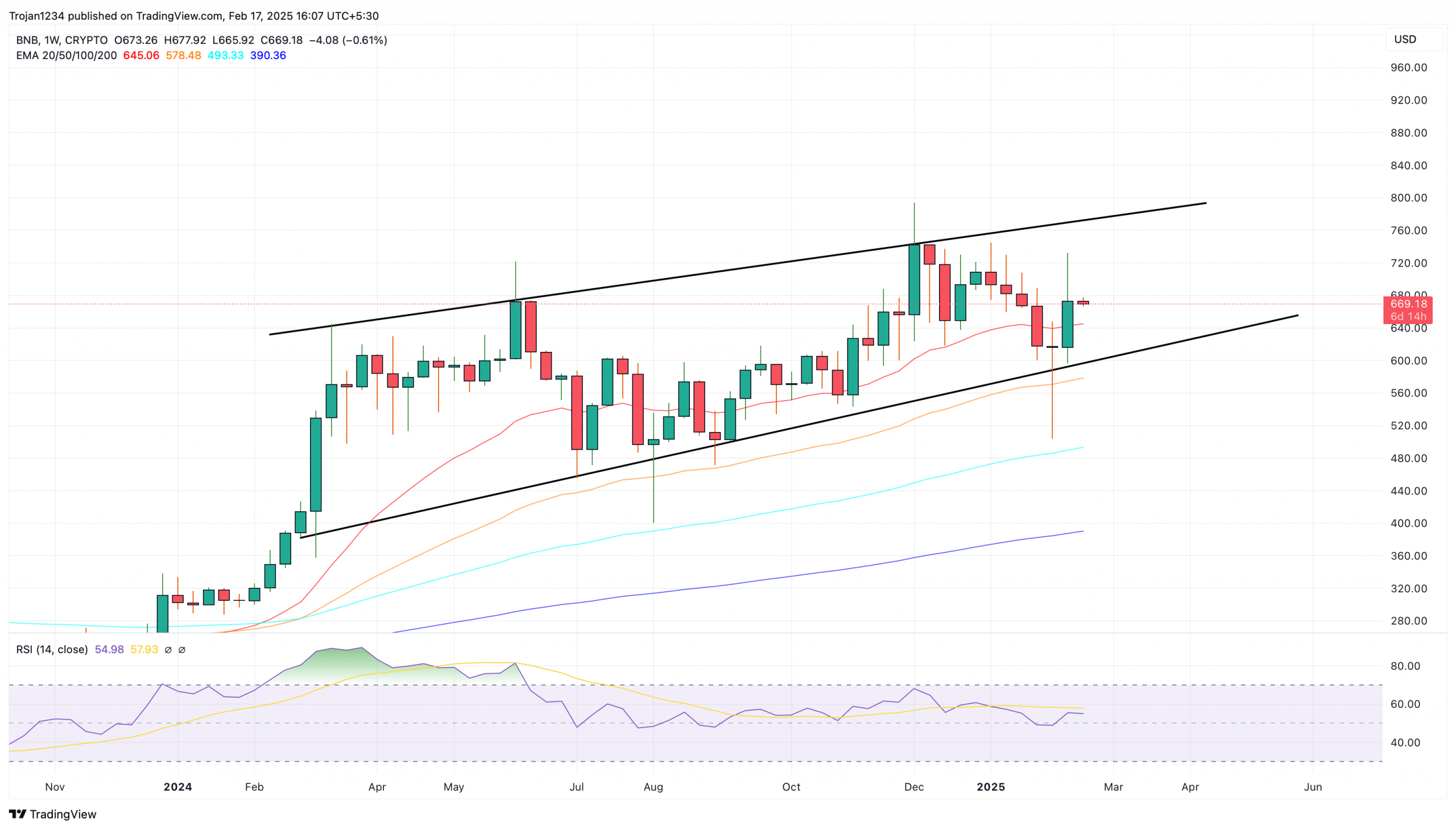 El precio de BNB ha registrado un máximo semanal de $732 y actualmente se negocia en torno a los $672, lo que representa una corrección del 8% en la semana.