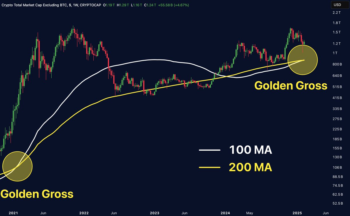 En primer lugar, la media móvil de 100 semanas y la de 200 semanas de la capitalización total del mercado cripto (excluyendo Bitcoin) están a punto de realizar un cruce alcista. La última vez que ocurrió un “cruce dorado” entre estos indicadores fue durante la altseason de 2021.