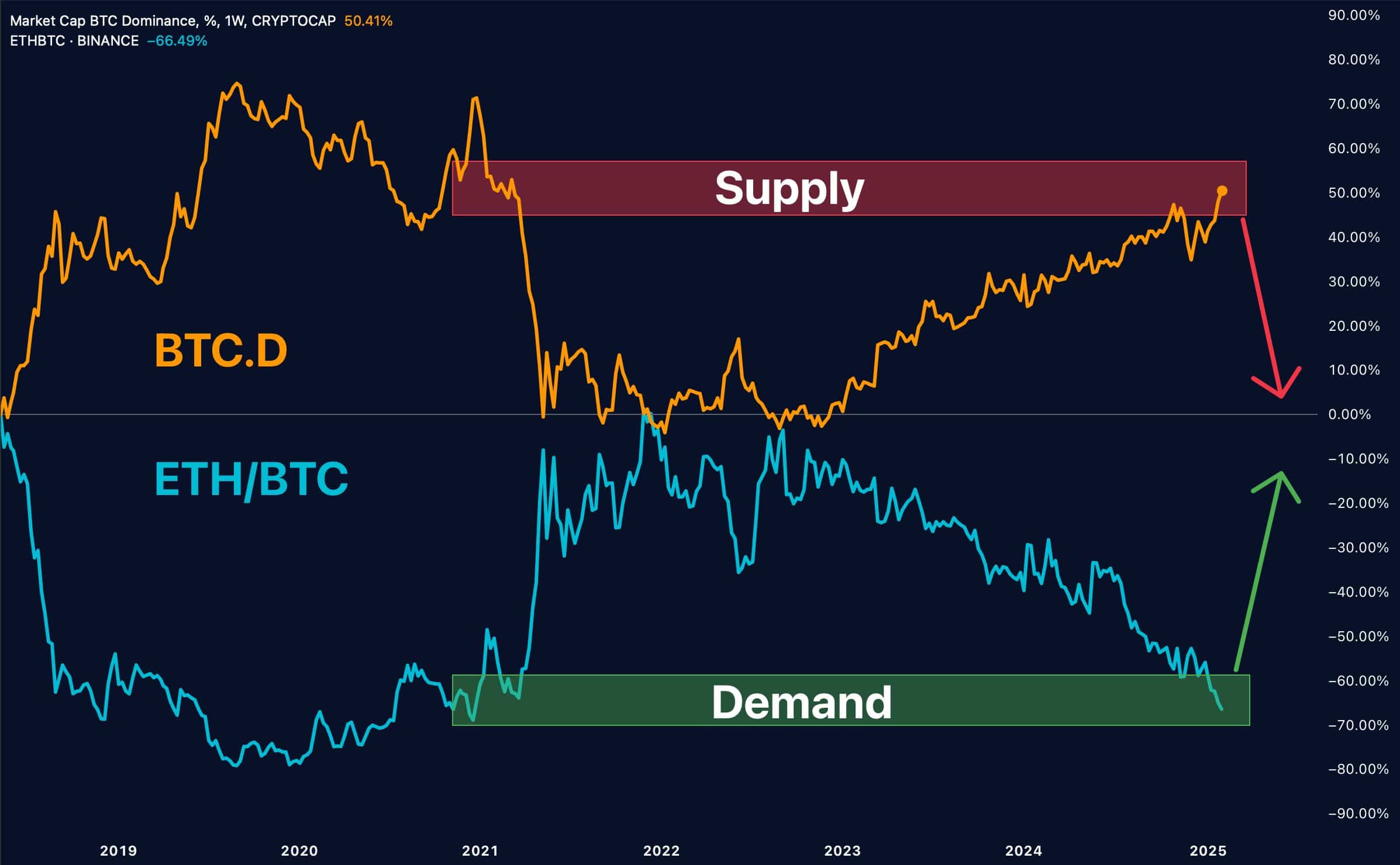 - Dominancia de Bitcoin: BTC se encuentra en una zona de oferta clave, superando el 50% de dominancia. Históricamente, este nivel ha marcado puntos de inflexión para el mercado de altcoins.