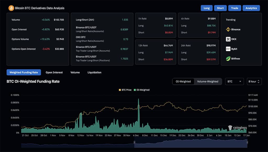 El mercado de derivados también refleja un sentimiento positivo. El interés abierto de bitcoin ha aumentado un 5,82%, alcanzando los $65.930 millones, mientras que el volumen de opciones creció un 10,60%, llegando a $4.000 millones.