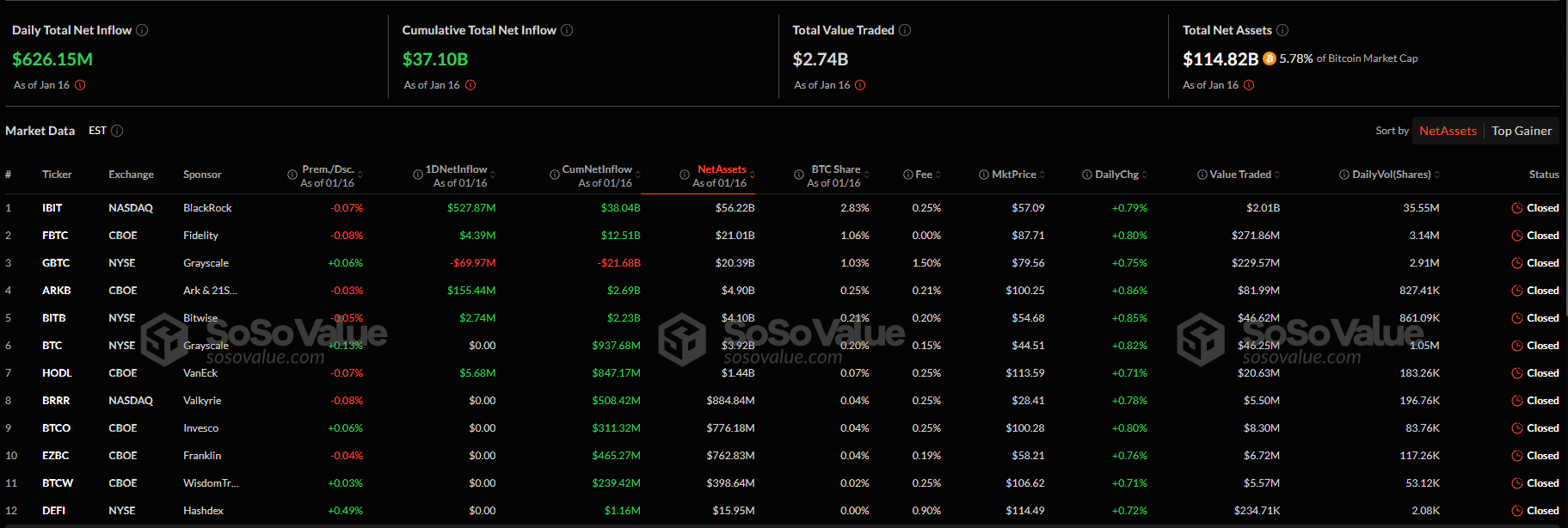 El respaldo de las instituciones ha sido fundamental para el reciente aumento de bitcoin. El flujo neto diario de ETFs de bitcoin en Estados Unidos alcanzó los $626.15 millones el 16 de enero, lo que demuestra un fuerte interés por parte de los inversores institucionales.