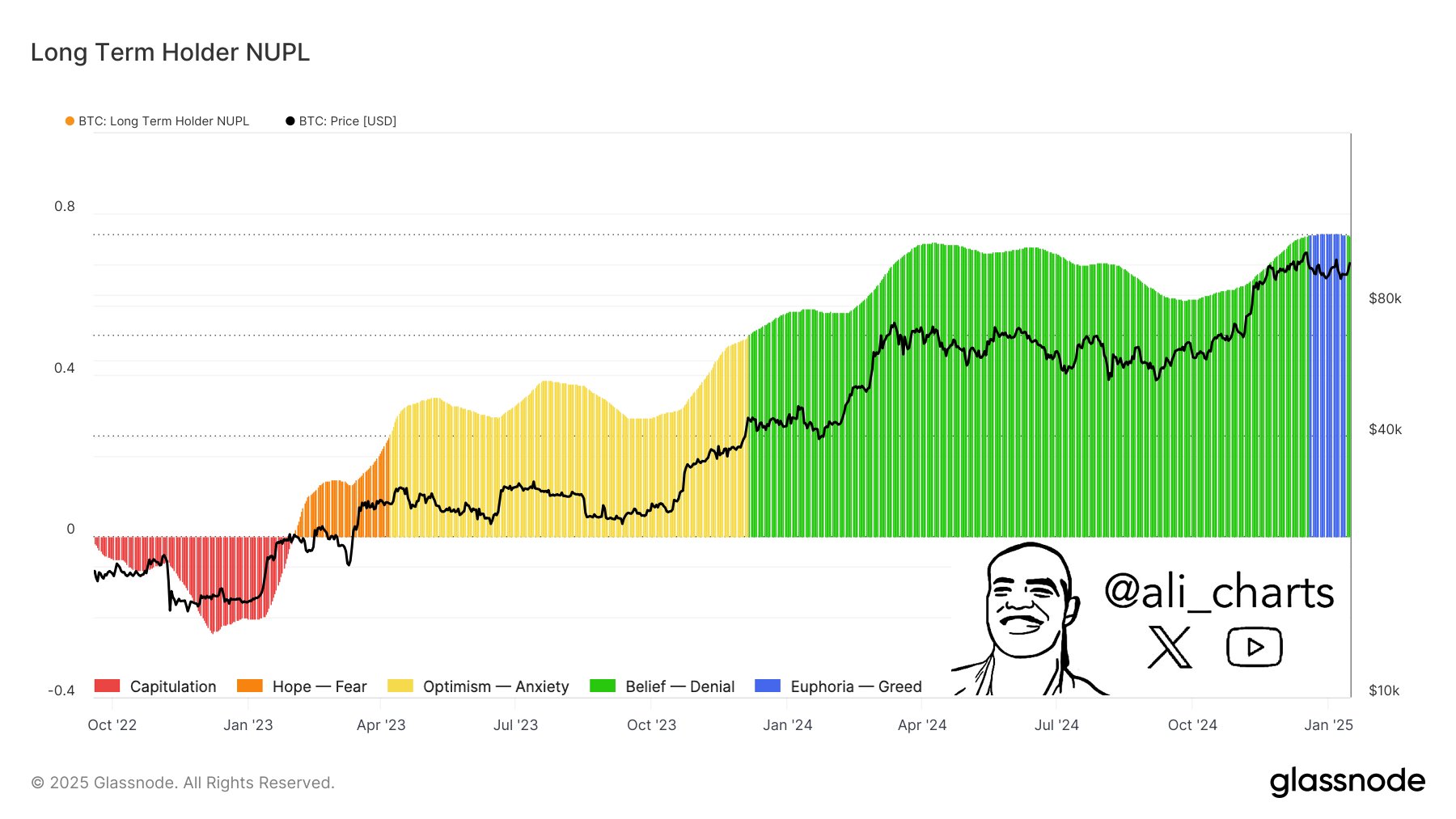 Los holders a largo plazo están mostrando una mayor codicia a medida que bitcoin supera los $100.000. Esto es evidente en el indicador NUPL (Net Unrealized Profit/Loss), que ha alcanzado la etapa de euforia.