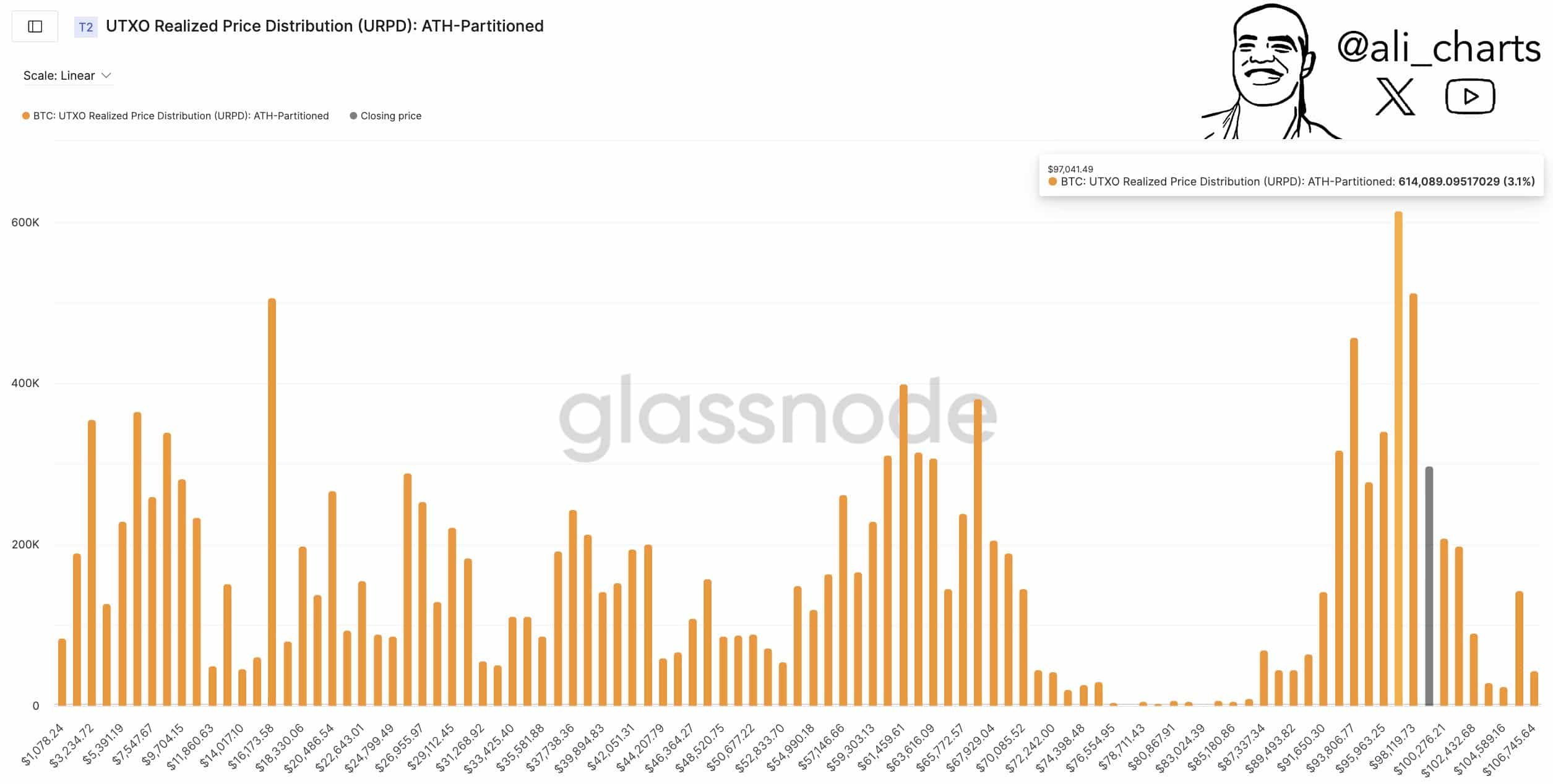 Según el indicador de distribución de precios realizados por UTXO, el nivel de $97.000 actúa como soporte clave. Mientras este nivel se mantenga, el rally alcista general continuará, aunque podría haber correcciones a corto plazo debido a la volatilidad del mercado.
