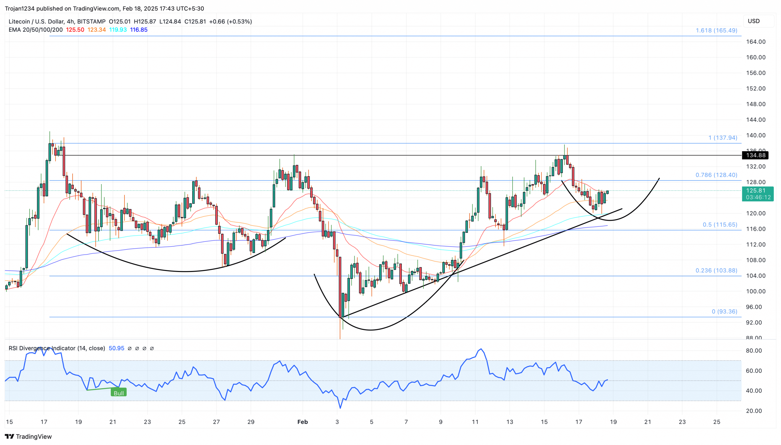 Recientemente, el precio de LTC retrocedió hacia la EMA de 100 períodos en el gráfico de 4 horas, encontrando soporte en la línea de tendencia local. Actualmente, Litecoin cotiza a $125.81, con una recuperación intradía del 3.02%, superando la caída del 2.69% de la noche anterior. Además, el rechazo de precios en los niveles más bajos sugiere que el impulso alcista podría continuar.