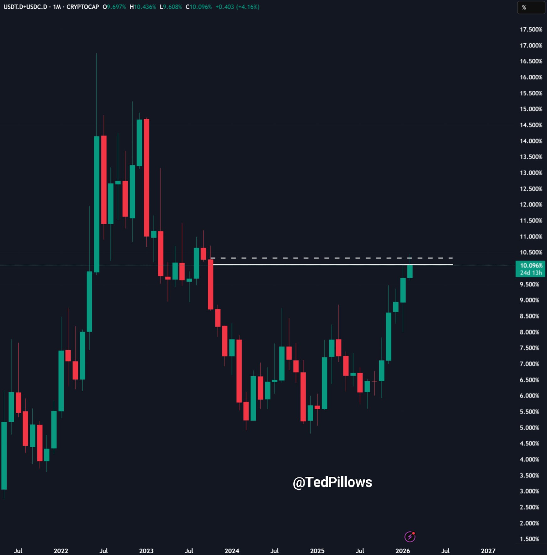 El aumento de la dominancia de stablecoins también sugiere que el mercado podría estar preparándose para futuras oportunidades de compra, una dinámica observada en ciclos bajistas anteriores.