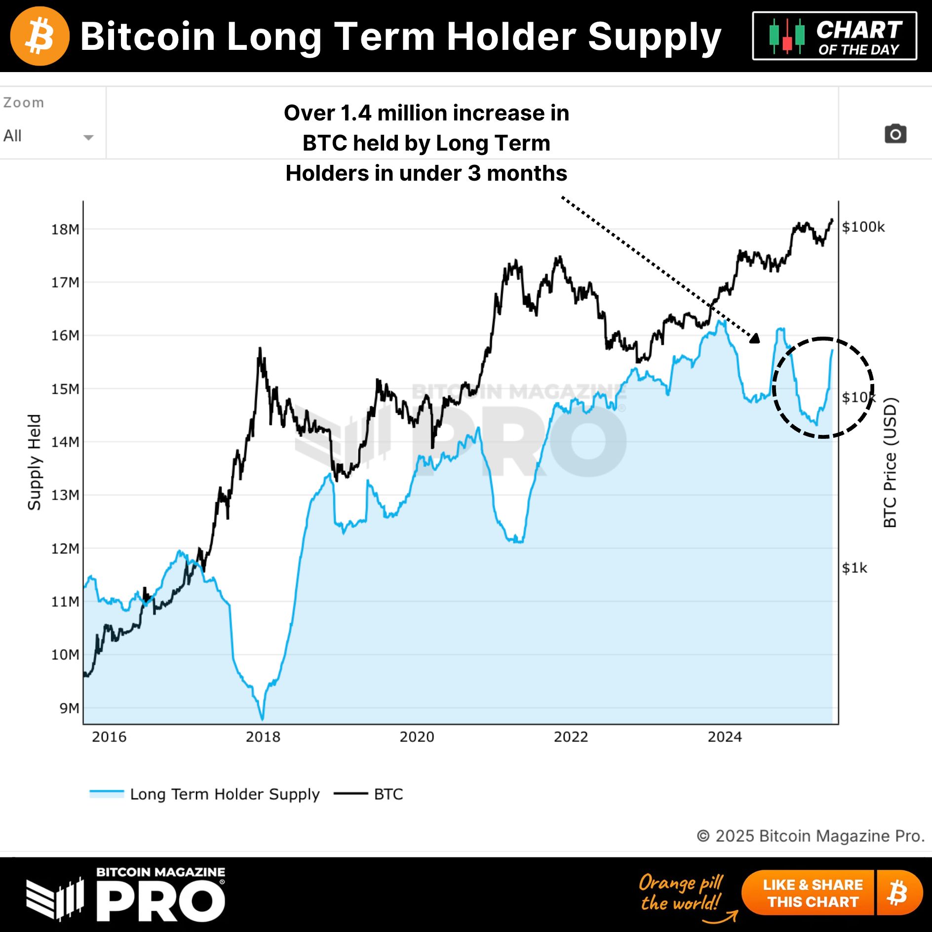 Según datos de Bitcoin Magazine Pro, entre el 3 de marzo y el 25 de mayo de 2025, el suministro total en manos de holders a largo plazo aumentó de 14.354.038 BTC a 15.739.438 BTC. En menos de tres meses, se han acumulado más de 1.39 millones de BTC, una cifra histórica.