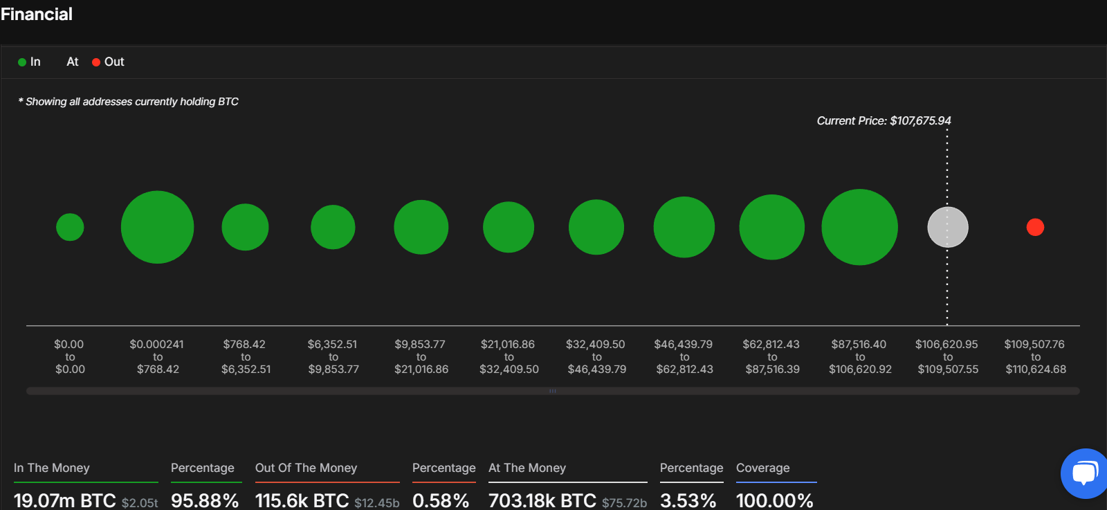 De acuerdo con un análisis en cadena de IntoTheBlock, tomando como referencia un precio de $107,675.94: