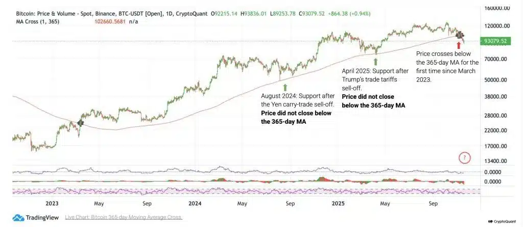 Pero el punto más crítico es otro: Bitcoin cayó por debajo de su media móvil de 365 días, un indicador técnico clave que no había sido perforado ni siquiera en las correcciones más fuertes de 2023 y 2024.