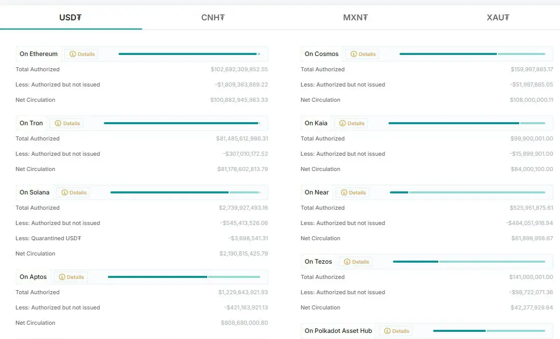 A nivel global, Tether mantiene una circulación neta de USDT de $100.882 millones, con $1.809 millones autorizados pero no emitidos, lo que eleva el suministro total autorizado a $102.691 millones.
