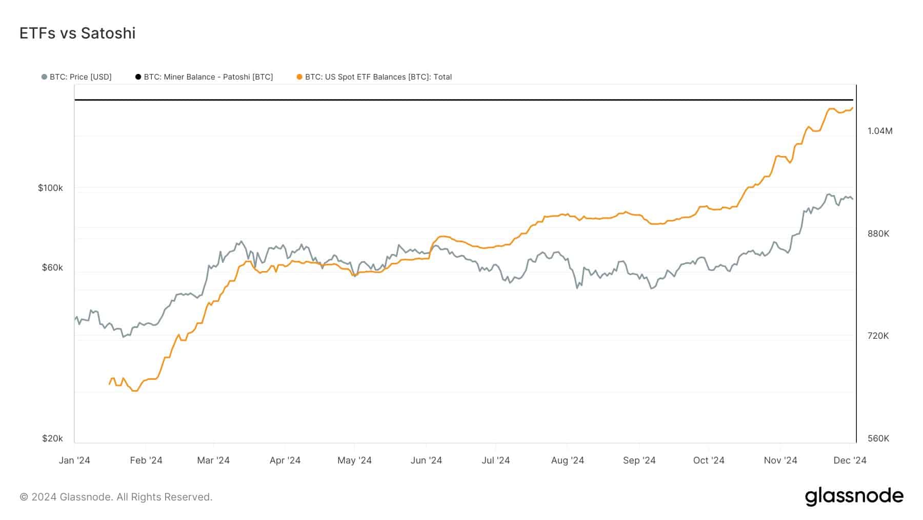 Para superar las tenencias de Satoshi, los ETFs necesitarían aproximadamente $1.23 mil millones adicionales en entradas al precio actual de mercado. Este logro consolidaría a los ETFs como los mayores poseedores individuales de Bitcoin, un título que anteriormente pertenecía a corporaciones como MicroStrategy.